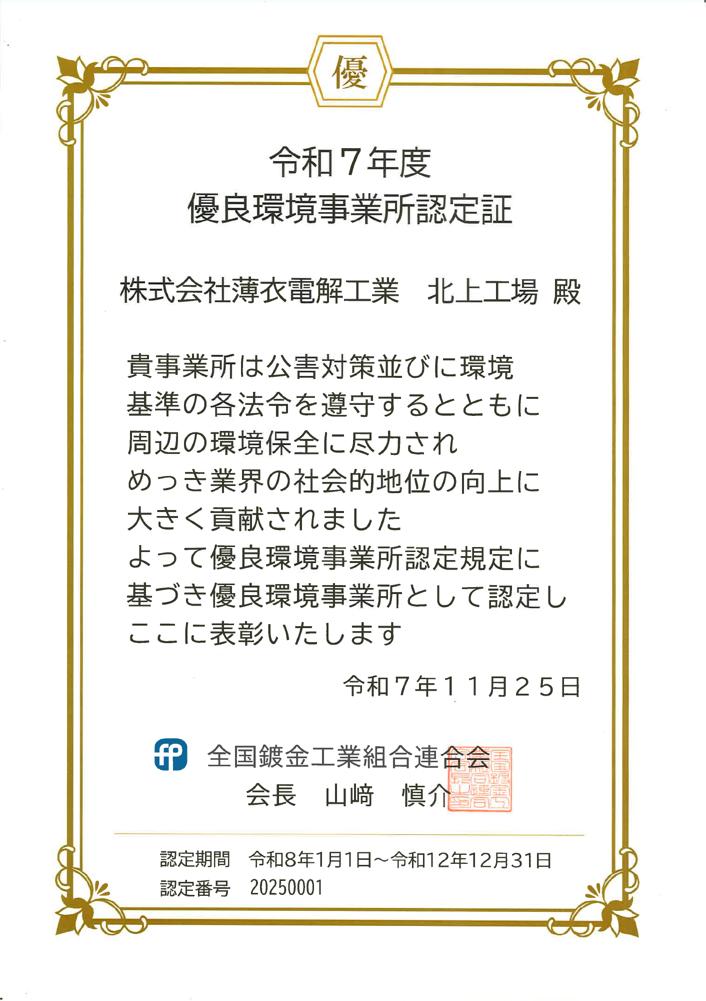 全国鍍金工業組合連合会より、優良環境事業所の認定を受けました